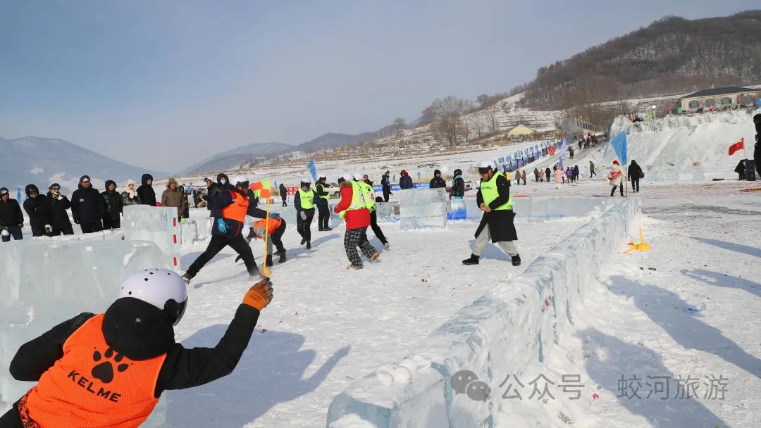 現場,游客們還可以在松花湖冰面上體驗滑冰、冬釣、雪地摩托、雪圈等特色項目。除了這些好玩的冰雪項目外,今年冰雪漁獵文化旅游節還舉行了“中國雪戰 吉林蛟河松花湖特別賽”,來自全市8支代表隊56名冰雪愛好者在冰面上展開激烈角逐,隊員們以冰墻為掩護,在進攻與躲閃間來回切換,比賽緊張刺激,但又充滿著玩冰踏雪的樂趣。