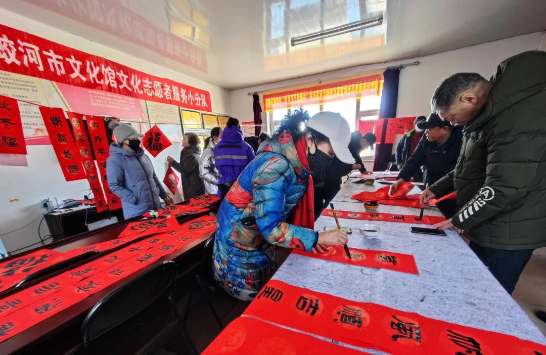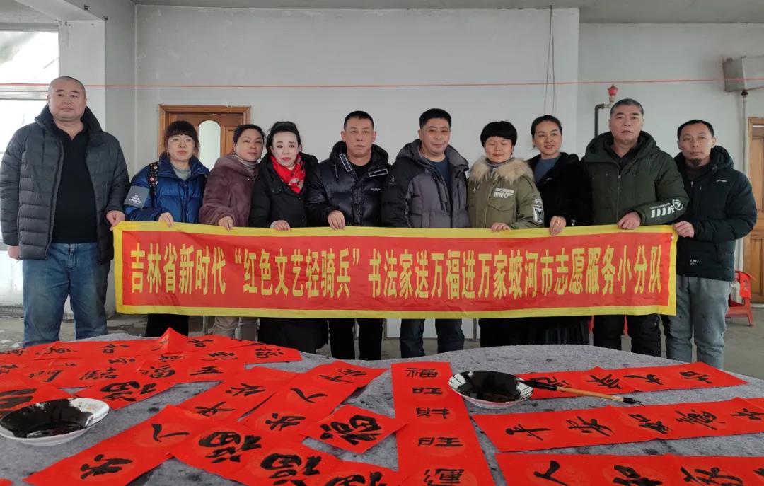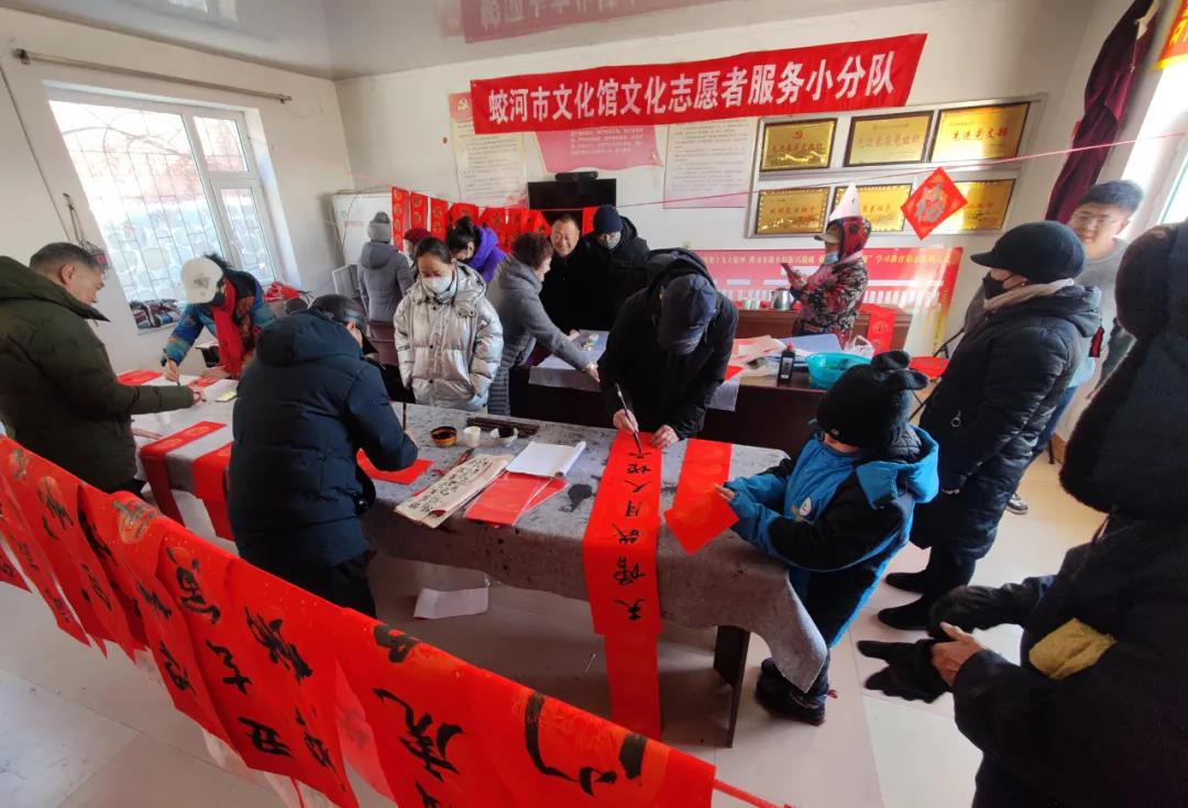 2022年 1月14日、15日兩天,蛟河市“新時代紅色文藝輕騎兵”文化志愿服務小分隊分別到黃松甸鎮黃松甸村、漂河鎮四道溝村為群眾送去了節日的祝福和問候。蛟河市文化志愿者為群眾書寫了500多副春聯和福字,拍攝全家福打印照片80余張,并把春聯、福字和照片贈送給當地群眾?!叭潯逼陂g,開展寫春聯送福字,拍攝全家福進農家文化志愿服務活動,營造濃厚喜慶祥和的節日氛圍,活躍城鄉節日群眾文化生活。