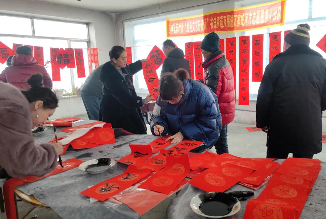 1月14日,文化惠農志愿服務書法家小分隊到黃松甸鎮黃松甸村為村民現場寫春聯送福字